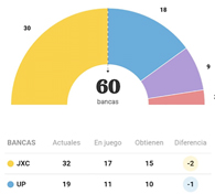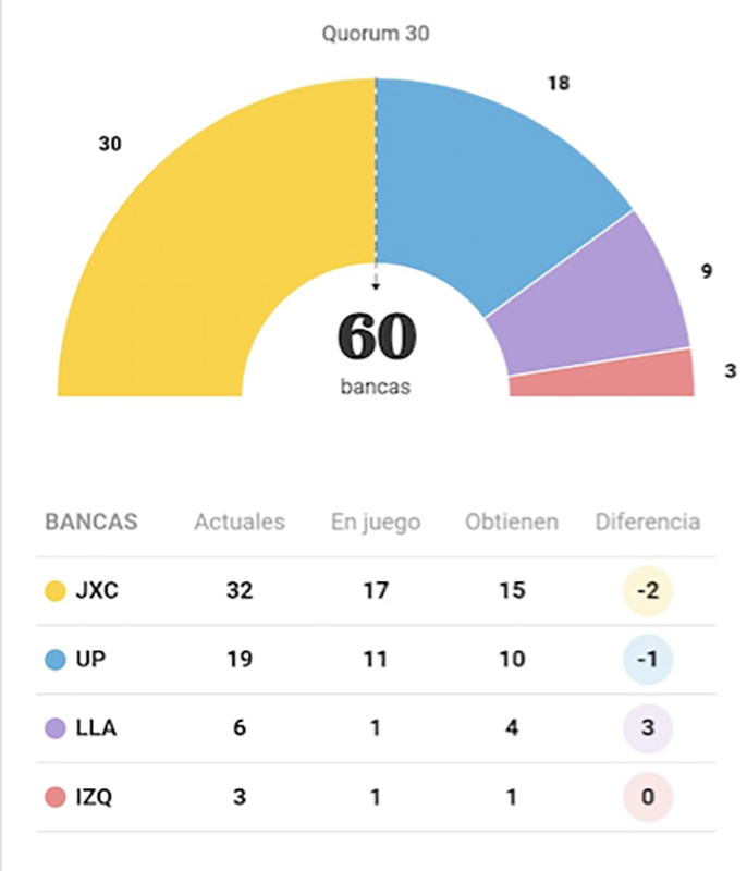 Con estos resultados, si Juntos por el Cambio permanece unida, se quedará a partir del 10 de diciembre con 30 diputados (dos menos que en la actual conformación), UP tendrá 18 (uno menos que ahora, aunque está esperando el recuento definitivo que de haber alguna inclinación a favor de la fuerza, le permitiría entrar a Delfina Velázquez, una vecina de la comuna 11 que fue comunera en el período 2011-2019).