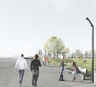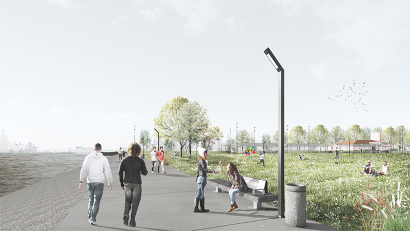 Incluye un paseo lineal de cara al río con 7,6 km de borde costero continuado con nuevas superficies verdes. Además, ofrecerá actividades culturales, comerciales, deportivas y de entretenimiento. Los espacios comerciales no podrán superar el 35% de la superficie total.