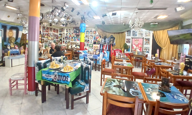 Conocimos La Cafetería de D10S que desde hace 5 años funciona en la esquina de Álvarez Jonte y Gavilán, atendida por el matrimonio de Claudio, Liliana y su hijo Emanuel. Claudio nos contó cómo armaron este sueño donde hay cientos de remeras, cuadros, fotos, medallas, trofeos, todo relacionado a Diego Maradona.